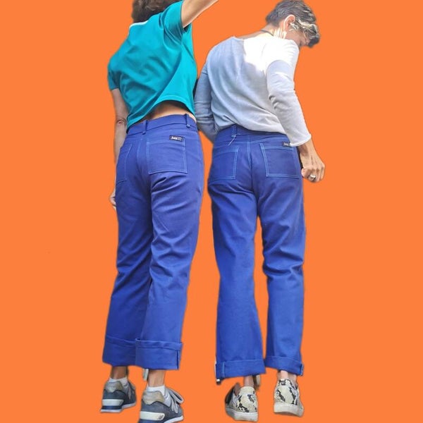 Ici les 2 pantalons sont en sergé 300gr/m² surpiqures bleues claires.